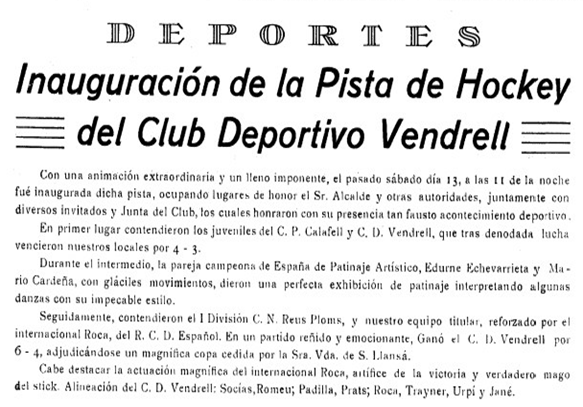 El 13 de Setembre de 1958 a les 11 de la nit, es va inaugurar oficialment la pista d’ Hoquei del CE Vendrell . L’acte va acabar amb un partit entre el CN Reus Ploms ( 1a Divisió) i el CE Vendrell, reforçat amb el jugador internacional Roca del RCD Espanyol, acabant el partit amb victòria vendrellenca per 6 gols a 4. L’alineació del CE Vendrell va ser: Isidre Socías, Ferran Romeu ,Francesc Padilla, Cisco Prats, Jesús Trayner, Ricard Urpí (que acabaria fitxant pel CP Calafell), Benet Jané i Roca ( RCD Espanyol).