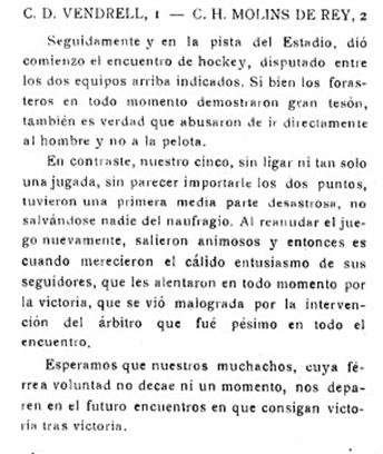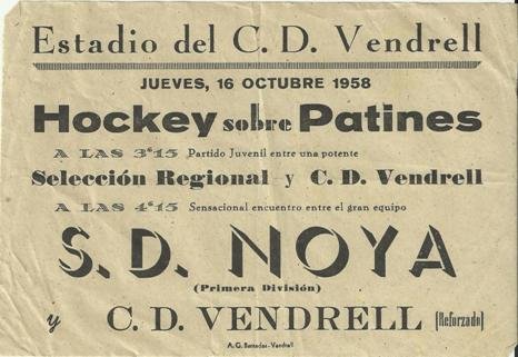 Crònica del primer partit oficial jugat a la pista del Velòdrom del CE Vendrell el 5 d’octubre del 1958 contra el CH Molins de Rei, publicat a la revista quinzenal Vendrell Portavoz Católico de la Villa del 11 Octubre 1958