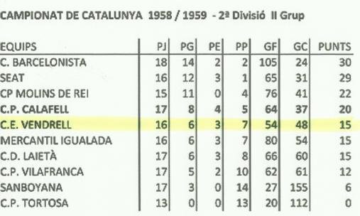 El CE Vendrell va jugar a la 2a Divisió Catalana, grup 2, quedant 7è classificat amb 17 punts (empatat amb el 5è.) entre 10 equips. El primer President de la secció d’ Hoquei Patins del C.E. Vendrell va ser Josep Trillas (1958 al 1961). A la Junta Directiva, també hi figurava el Cisco Prats que compaginava aquesta tasca amb la de jugador i entrenador.